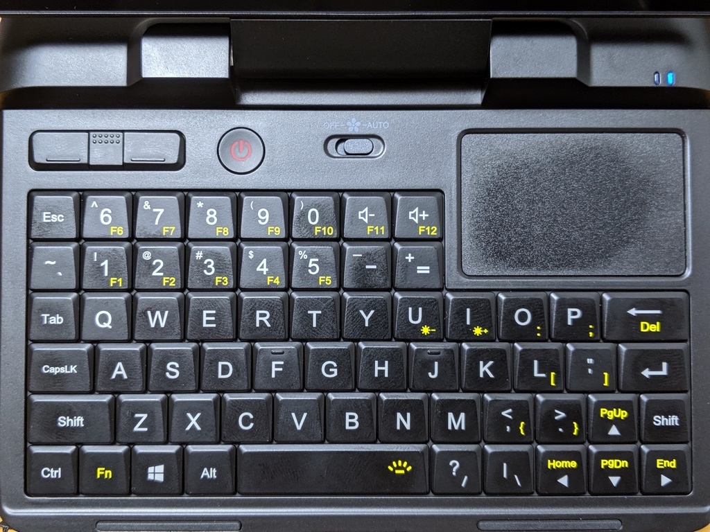 縦方向はやや狭く、キーピッチは小さい上に、キーがとても重いのでタッチタイプには向いていない。 親指タイプが基本となるだろう。 このため、日本語入力が大きな問題となる。 英字キーボードの場合、IMEのOn/OffはAlt+~で行うが、右Altがないため、左手で、Alt+~を押下するのが難しい。