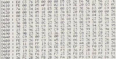D600 : E0 C3 76 D5 00 00 00 D5 CD 26 D6 0E 20 06 20 7E D610 : FE 00 20 05 AF D3 02 D1 C9 3E 20 D3 0C 7B D3 0C D620 : 7A CD 34 D6 18 E5 3E 08 03 02 3E 36 D3 0F C5 00 D630 : 00 00 16 05 1E 00 1B 7A B3 20 FB C9 00 00 00 36 D640 : 80 23 36 81 23 36 62 C9 36 83 23 36 84 23 36 80 D650 : C9 36 86 23 36 87 23 36 88 C9 36 89 23 36 8 23 D660 : 36 8B C9 36 8C 23 36 8D 23 36 8E C9 36 8F 23 36 D670 : 90 23 36 91 C9 36 92 23 36 93 23 36 94 C3 36 95 D630 : 23 36 96 23 36 97 C9 36 98 23 36 99 23 36 9A C8 D690 : 36 9B 23 36 9C 23 36 9D C9 36 CA 23 36 CB 23 36 D6A0 : CC C 36 00 23 36 00 23 36 00 23 C9 36 FD 23 36 D680 : FE 23 36 FF C9 36 A5 23 36 A6 23 36 A7 23 36 A8 D6C0 : D5 11 88 FF 19 D1 36 B3 2B 36 A4 2B 36 A3 2B 36 DED0 : A2 C9 36 ED 23 36 EE 23 36 EF 23 36 F0 D5 11 88 D6E0 : FF 19 D1 36 F4 2B 36 F3 2B 36 F2 2B 36 F1 C3 36 D6F0 : F5 23 36 F6 23 36 F7 23 36 F8 D5 11 88 FF 19 D1 D700 : 36 FC 2B 36 FB 2B 36 FA 2B 36 F9 C3 CD A2 D6 36